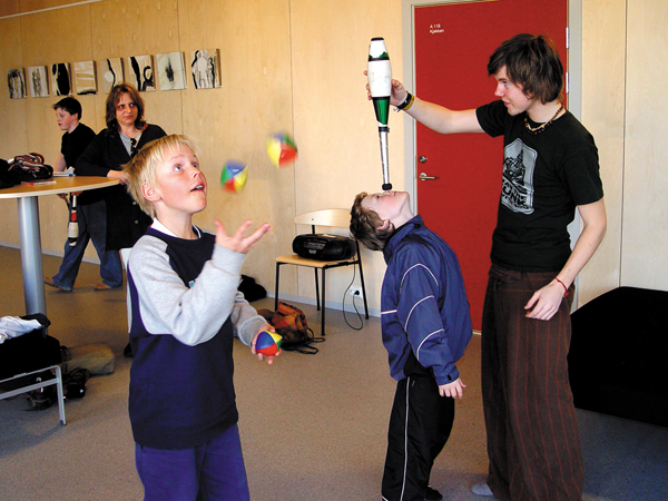 Rockemusikken kommer fra en liten bærbar cd-spiller. Ivrige hender hiver baller og andre sjongleringsverktøy i luften. Noen er litt uvørne og mister ting i gulvet. Andre styrer med tunga og holder ballene i luften.